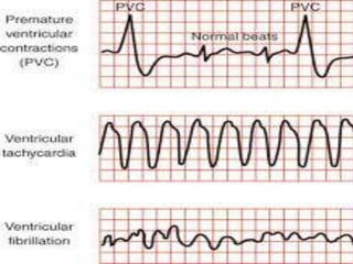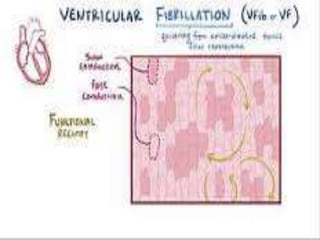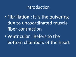 Ventricular fibrillation occurs when the ventricles of the heart quiver due to uncoordinated contractions of the heart muscle fibers. This prevents the heart from effectively pumping blood throughout the body. Ventricular fibrillation can be caused by stress, damage, or electrical changes to heart tissue. It requires immediate treatment through defibrillation or medications to prevent organ damage or death from lack of oxygen.