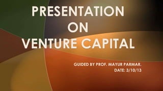 Venture capital is funding provided to startup companies and small businesses with perceived long-term growth potential. It involves three main actors: venture capital funds that manage money from investors, the investors who provide this money, and the entrepreneurial companies that receive the funding. There are typically five stages of venture capital funding as a company grows from an idea to commercialization to expansion. Venture capital carries high risk but also high potential returns and has played an important role in economic growth and job creation.