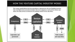 The venture capital process involves six sequential steps - deal origination, screening, due diligence, deal structuring, post-investment activity, and exit. Venture capital in India comes from government development institutions, public/private banks, private sector companies, and overseas funds. Micro venture capital provides smaller seed investments of 50 lakhs to 1.5 crore rupees to startups that have yet to gain traction, compared to larger traditional venture