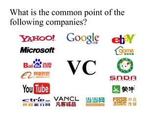 Venture capital firms provide funding for startup companies and manage large funds from institutions and wealthy investors. They look for companies in high-growth industries like technology and assess them based on their business model, market potential, and management team. While most VC investments fail to return a profit, successful ones can provide high returns through events like a company's IPO or acquisition. Some well-known Chinese VC firms include Softbank, which earned a 1000% return on its investment in Alibaba, demonstrating the potential rewards of venture capital.