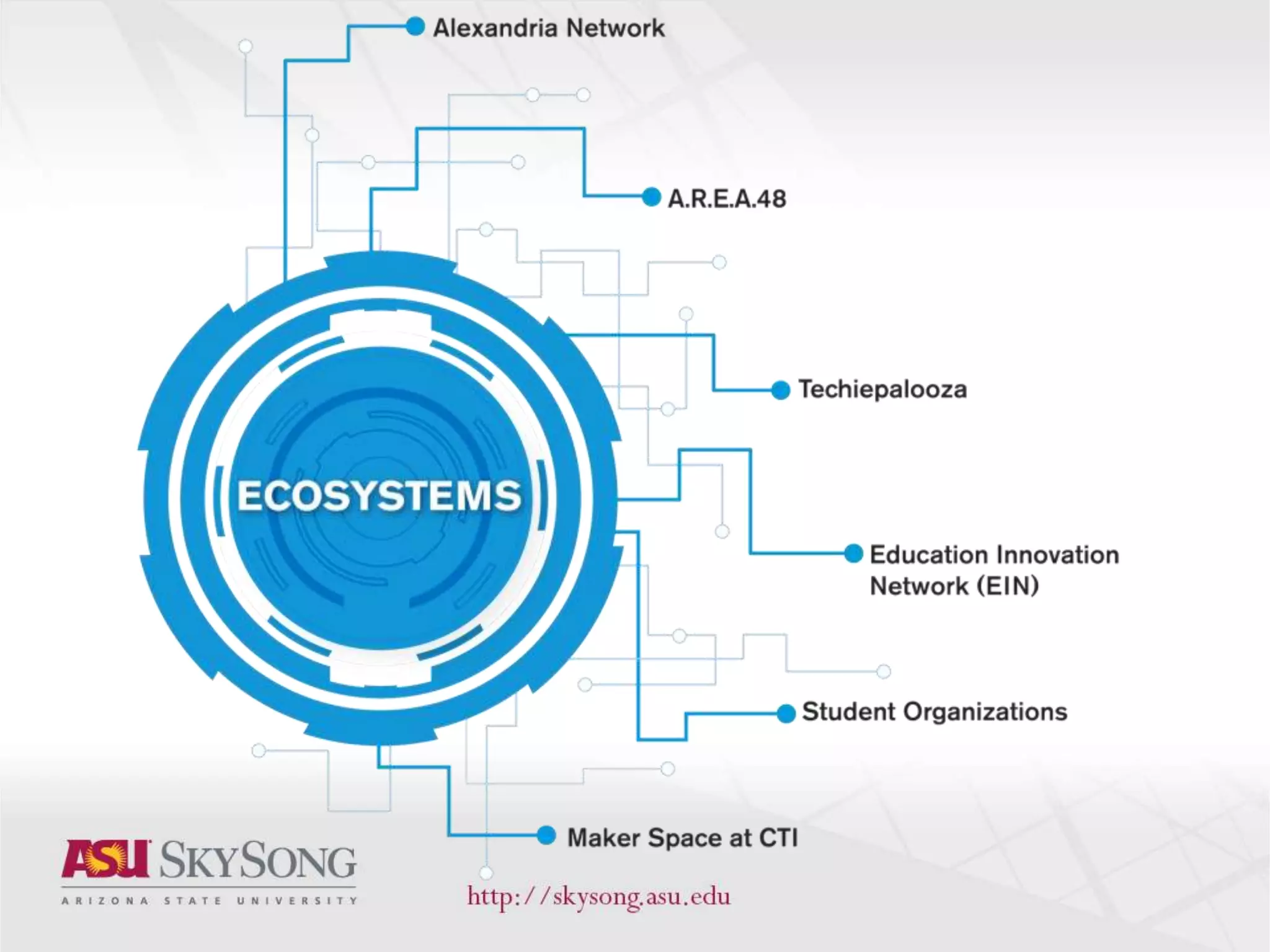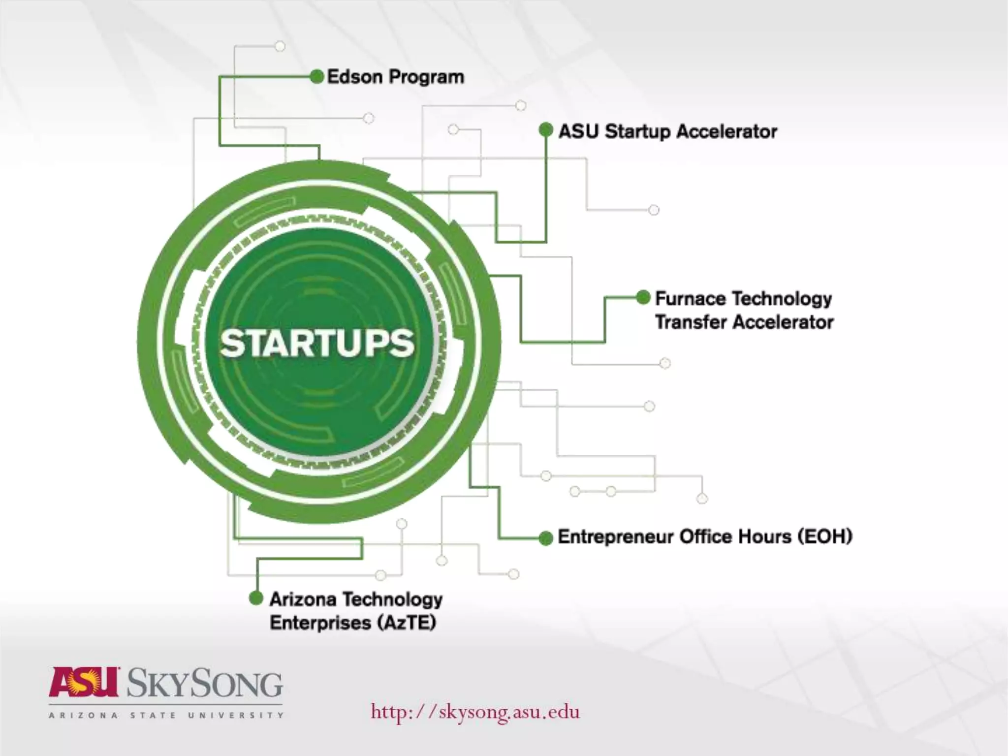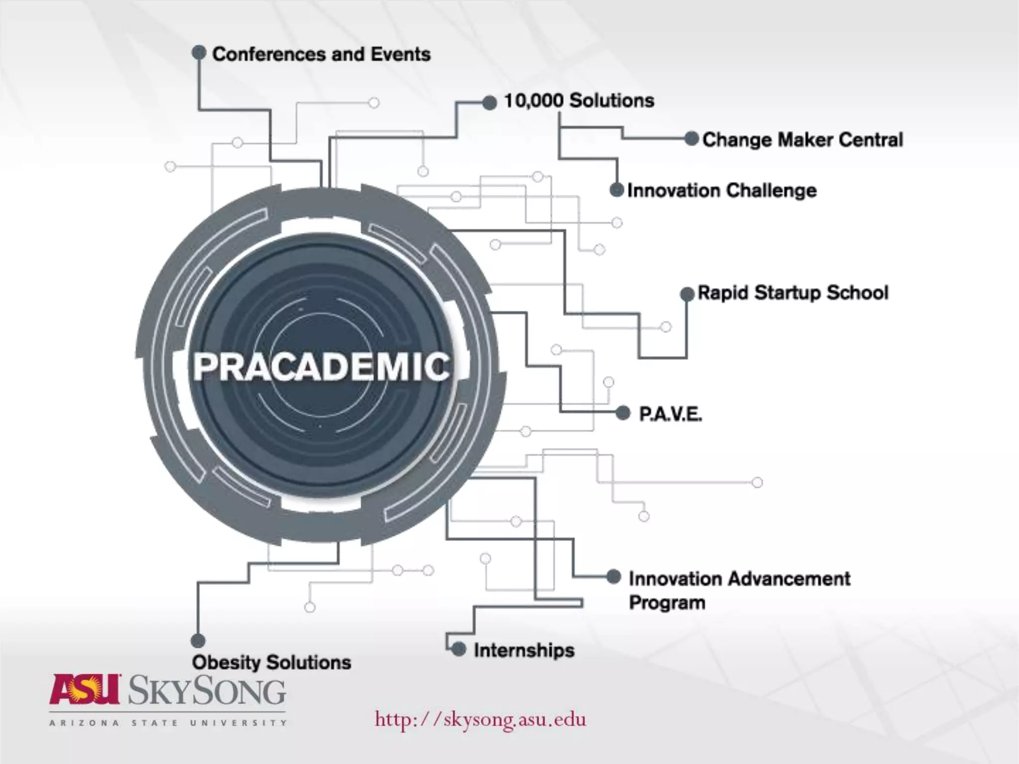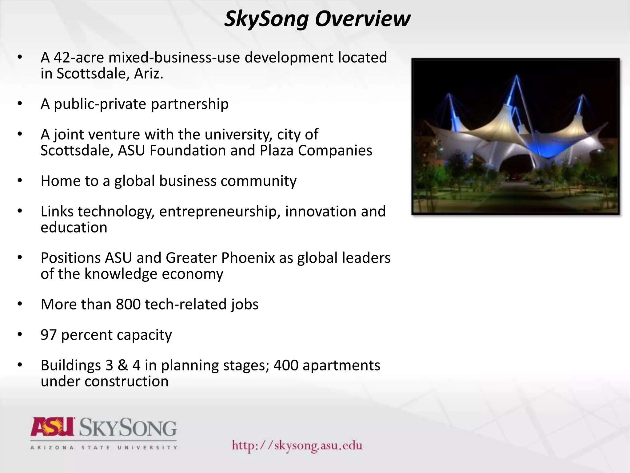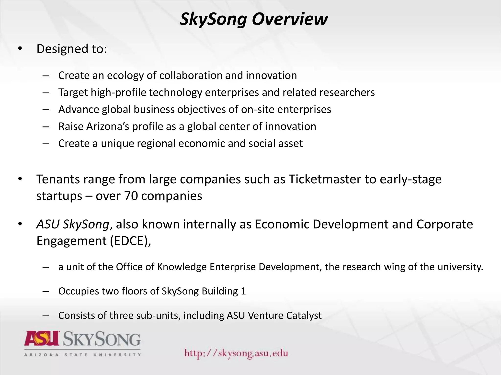 The document provides an overview of SkySong, a mixed-use development in Scottsdale, Arizona that is a public-private partnership between Arizona State University, the city of Scottsdale, and private companies. It aims to create an environment that fosters collaboration, innovation, and the growth of technology enterprises. The document also summarizes several ASU initiatives to support entrepreneurship through accelerators, training programs, co-working spaces, and partnerships across Arizona.