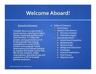 The document outlines a venture plan for 'Friendly Tours,' aimed at providing gluten-free travel experiences for adventurous travelers and their companions. It highlights the need for greater awareness and support for individuals with celiac disease while offering a structured subscription program with varying levels of service. The plan includes an expansion strategy over five years, targeting major cities in North America, Europe, Central and South America, and Asia.