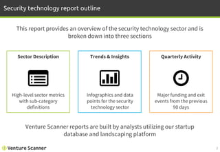 The March 2017 security technology report by Venture Scanner provides an overview of the security technology sector, detailing its landscape, categories, and trends. It highlights the emergence of 14 categories of security startups, with substantial funding amounts totaling $21 billion across various areas including threat detection and identity security. Additionally, the report indicates a notable increase in venture capital funding and acquisitions within the sector, reflecting its growing significance and activity.
