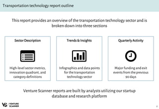 The report provides an overview of the transportation technology sector, detailing the various categories of startups and funding amounts, with a total of 1,148 companies receiving $84 billion in funding as of August 2017. Key insights include the dominance of ride-hailing companies, which account for 48% of venture funding, and the trends showing an increase in investments and acquisition exits within the sector. The data reveals that startups founded in 2012 lead the market in funding, reflecting the competitiveness and rapid growth in this industry.