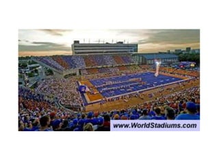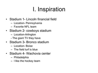 Kacey Powell proposes designs for a new stadium called Powell Stadium. It would be located near an airport for convenience and sponsored by Walmart. The stadium would include various food vendors like McDonald's, Burger King, and Five Guys. It would also host several events like a motocross race, car show, and paintball tournament to attract visitors.