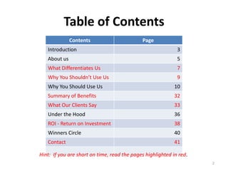 The document summarizes the benefits of using the Venue Claims Management System. It highlights increased efficiency through automation, flexibility to meet client needs, improved performance monitoring of staff, streamlined document management, and enhanced business intelligence and profitability. Client testimonials praise benefits like reduced administration time, ease of billing, and customized functionality meeting their needs. The system provides a competitive advantage through workflow streamlining and reduces redundant data.