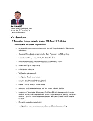 Venugopal has over 10 years of experience as an IT technician based in Dubai, UAE, with skills in hardware and software troubleshooting, system administration, networking, and customer support. He has certifications from Microsoft and Cisco and education includes a diploma in computer engineering. He is seeking new opportunities and can be contacted via email or mobile number provided.