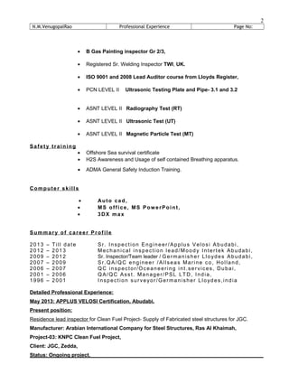 The document provides a summary of N.M.VenugopalRao's career experience and qualifications. It details over 18 years of experience in inspection engineering roles for pipeline, piping, and pressure vessel projects. Recent roles have included serving as a senior inspection engineer for Applus Velosi in Abu Dhabi and mechanical inspection lead for Moody Intertek. VenugopalRao holds relevant certifications and training in international codes and standards, and languages include English, Hindi, and Telugu.