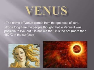 The planet Venus is named after the Roman goddess of love. While early people thought Venus could support life, it is actually far too hot, with surface temperatures over 450°C. Venus orbits between Earth and the sun and photos from satellites reveal its landscape consists primarily of volcanic zones, with no rivers or oceans and an orange, cloudy sky.