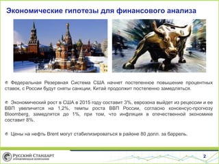 Документ представляет стратегию инвестирования в высокодоходные рублевые облигации, основываясь на экономических прогнозах и анализа рисков. Ожидается замедление экономики в США и России, влияние на инфляцию и процентные ставки, а также возможные сценарии цен на нефть. Стратегия предполагает диверсификацию и высокую ликвидность облигаций, предлагая потенциальную доходность от 12% до 17% при умеренном уровне риска.