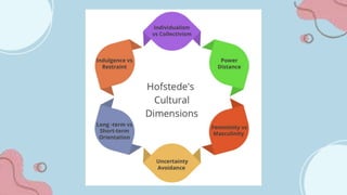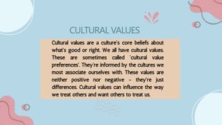 Cultural values differ between countries in important ways. Hofstede's cultural dimensions theory identifies six dimensions that describe cultural variations: power distance, individualism vs collectivism, masculinity vs femininity, uncertainty avoidance, long-term vs short-term orientation, and indulgence vs restraint. While values like equality may be universally important, behaviors seen as exemplifying values can differ cross-culturally. Understanding these cultural differences in communication styles and value priorities is important for improving intercultural relationships.