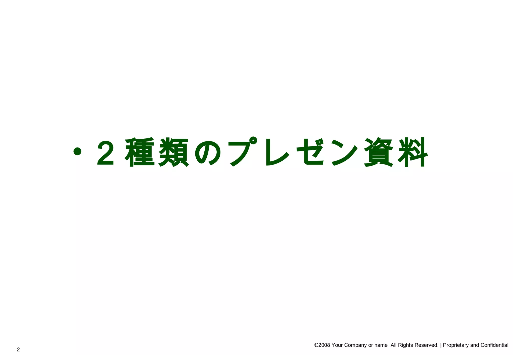 のプレゼン 10/20/30 のル ール Guy Kawasaki が編み出した投資家向けプレゼンのルール 10 枚のスライド 20 分のプレゼン時間 30 ポイント以上のフォントサイズ ※ 英語フォントは日本語フォントよりも小さく表示するため 、 62 日本語はフォントサイズ: 28 が適切だと思う ©2008 Your Company or name All Rights Reserved. | Proprietary and Confidential