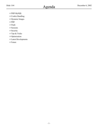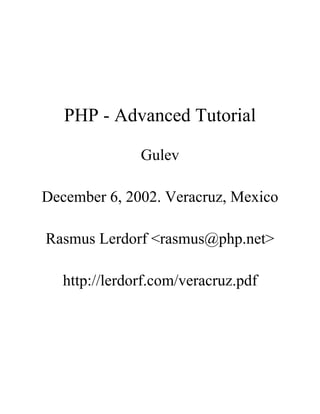 This document summarizes an advanced PHP tutorial presented by Rasmus Lerdorf. The tutorial covers topics such as PHP and MySQL integration, cookies, dynamic images, sessions, security, and optimization. The slides provide code examples for connecting to a MySQL database, performing queries, and storing user data. Examples are also given for generating dynamic images with GD, handling cookies, and building a simple and database-driven guestbook application.