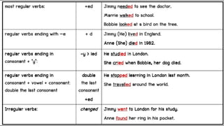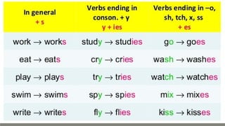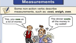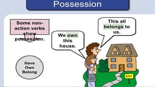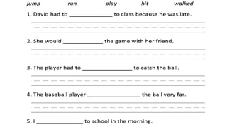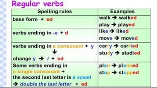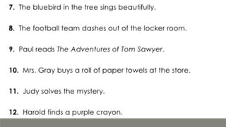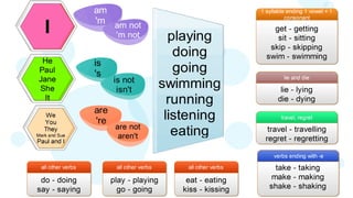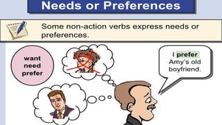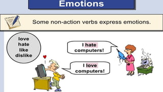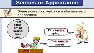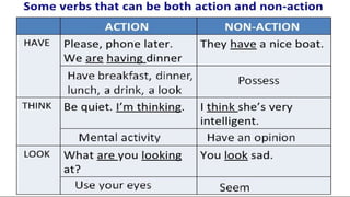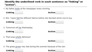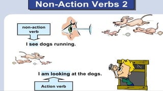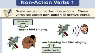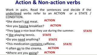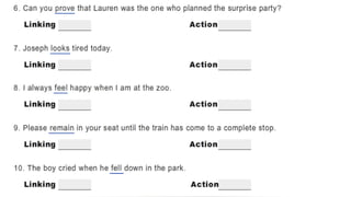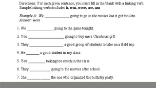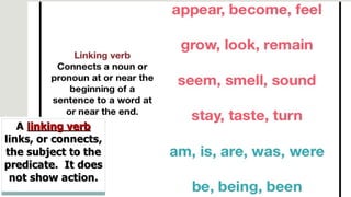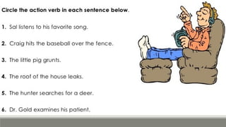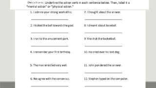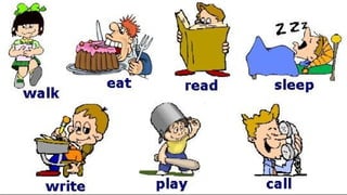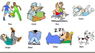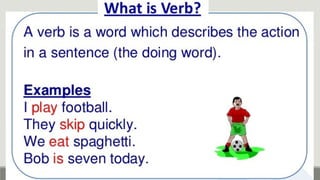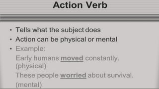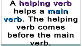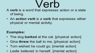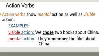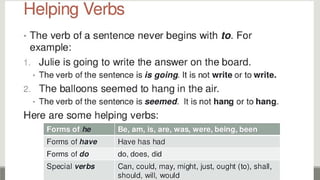 Verbs express actions, occurrences, or states of being. There are several types of verbs including action verbs, mental verbs, linking verbs, and helping verbs. Action verbs describe physical actions while mental verbs refer to cognitive states like thinking or understanding. Linking verbs describe conditions or situations like "is" or "are". Helping verbs add detail to verb tenses and convey meanings around expectations, permissions, and obligations. There are 13 verbs in English that can be used as helping verbs including forms of "be", "have", "do", "can", and "will".