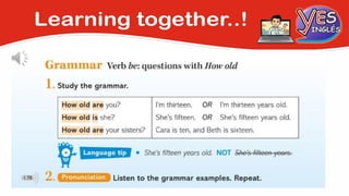 This document provides examples of asking and answering questions about age in English. It includes questions like "How old are you?", "How old is she?", and "How old are they?" along with sample answers providing ages in years old, such as "I'm 28 years old" or "She is 60 years old." The document encourages writing your own questions about the ages of friends' family members and provides examples like "How old is your dad?" followed by answering with a estimated age.