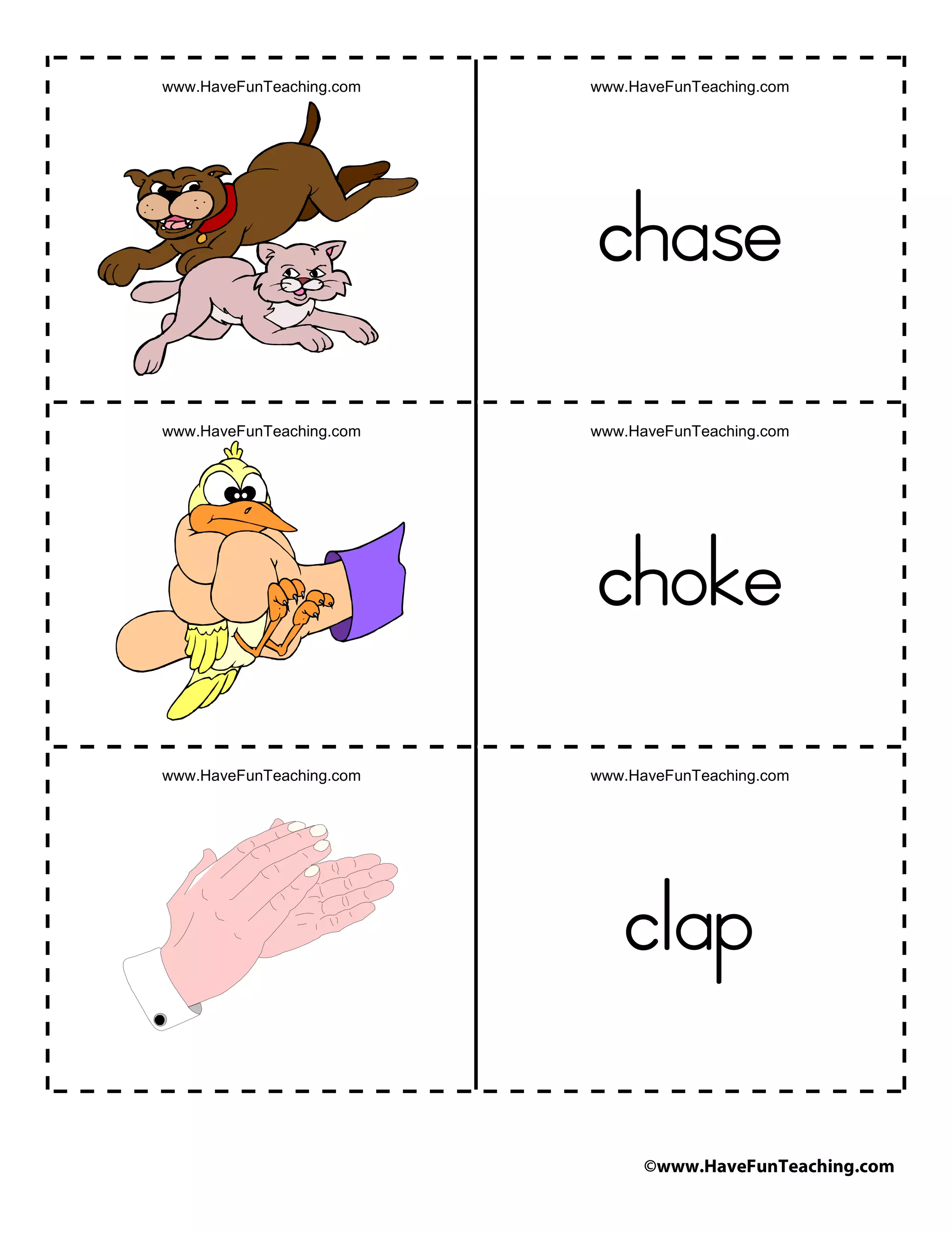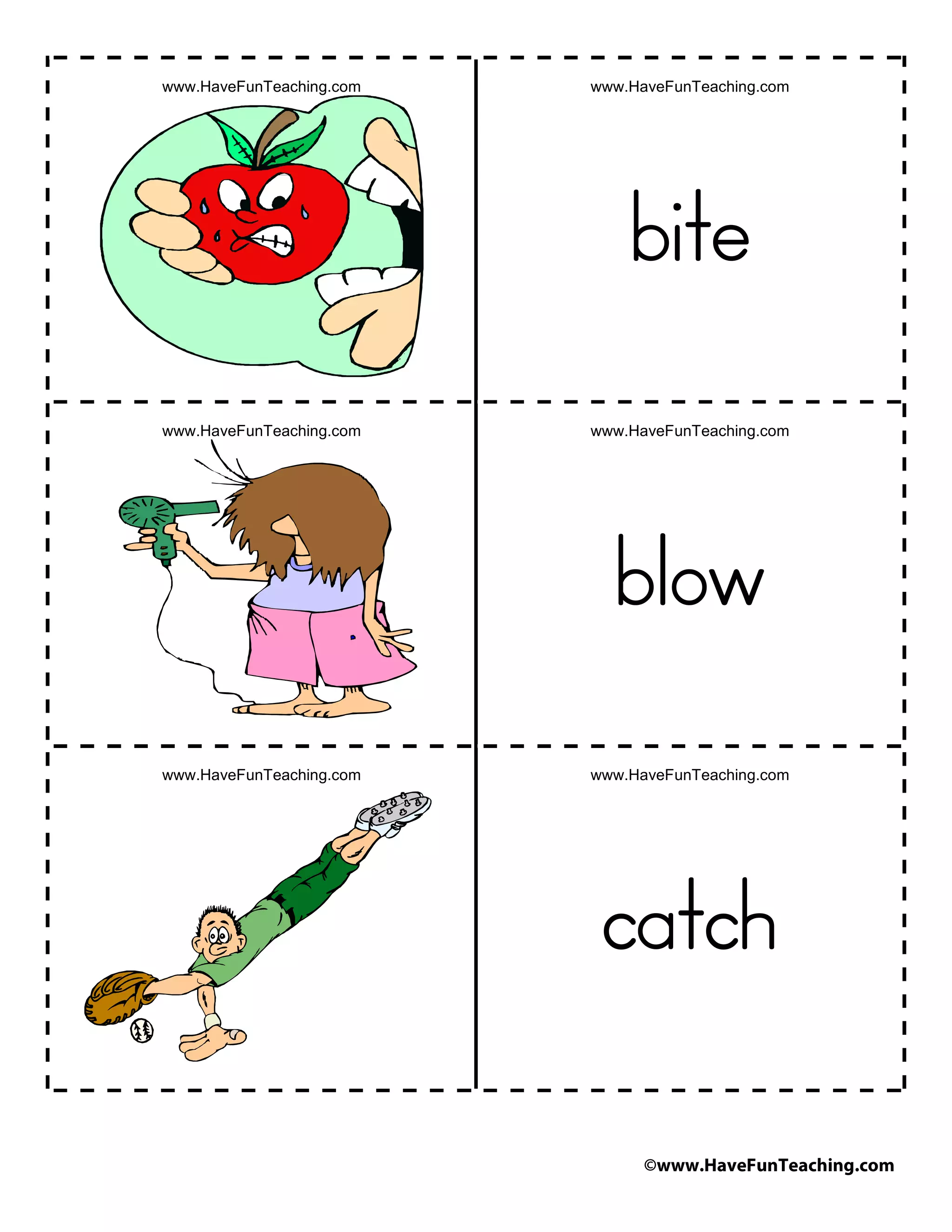 The document contains a list of verbs repeated multiple times and attributed to the website www.HaveFunTeaching.com. There are over 50 verbs listed in the document ranging from common actions like walk, talk, and eat to more unusual verbs like erupt, launch, and conduct. The list appears to be collecting verbs that could be used for teaching or activities.