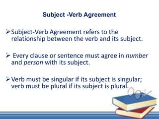 This document discusses subject-verb agreement rules. It explains that the verb must match the subject in number, so a singular subject takes a singular verb and a plural subject takes a plural verb. It provides many examples of singular and plural subjects and verbs. It also lists specific rules for collective nouns, compound subjects, measurements and times as subjects, subject-verb pairs before the subject, and other cases where singular or plural verbs are used.