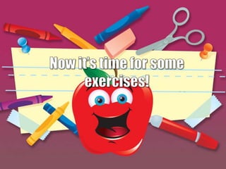 This document provides an overview of verb tenses in English including the past, present, and future tenses. It defines the forms of each tense and provides examples. It then outlines the common uses of each tense, such as using the past tense for completed actions and the present tense for facts or generalizations. The document concludes with exercises asking the reader to identify the correct verb tense in sentences and examples analyzing the tense of action verbs in descriptions of a baseball game.
