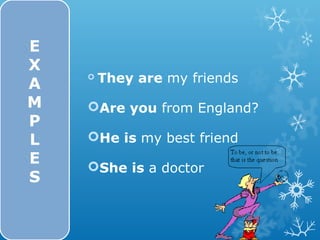 The document provides examples and explanations of the verb "to be" in English. It discusses using "to be" to show status or characteristics, and provides the long and short forms of the verb for each subject. Examples are given of affirmative, negative, and interrogative sentences. Common uses with occupations, locations, objects, and groups are listed. An exercise section prompts the reader to fill in blanks to complete sentences using "to be". The document teaches the basic uses and forms of the verb "to be" in English.