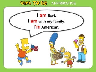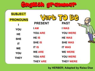 This document provides a lesson on present and past tense verbs in English. It covers the verbs "to be" in the present and past tense, including affirmative, negative, and interrogative forms. Examples are given for the first person singular and plural, second person singular and plural, third person singular, and possessive forms. Conjugations are provided for short answer questions. The document also includes exercises for students to practice filling in the correct forms of "to be" verbs.