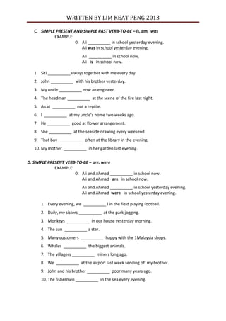 This document provides examples of using the verbs "to be" in simple present, simple past, and simple present and past tenses. It covers the forms "is, am, are" and "was, were" in affirmative sentences with subjects like people, places, things. Examples include "Ahmad is in the classroom", "They were at the canteen", and "My uncle is now an engineer." The document aims to illustrate correct usage of common linking verbs in English.