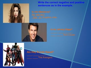The document contains a series of statements asking if certain people or groups are characters from comics or movies. The responses provide either negative or positive answers followed by alternatives. It serves as a demonstration of using correct negative and positive sentences in response to statements of identification.