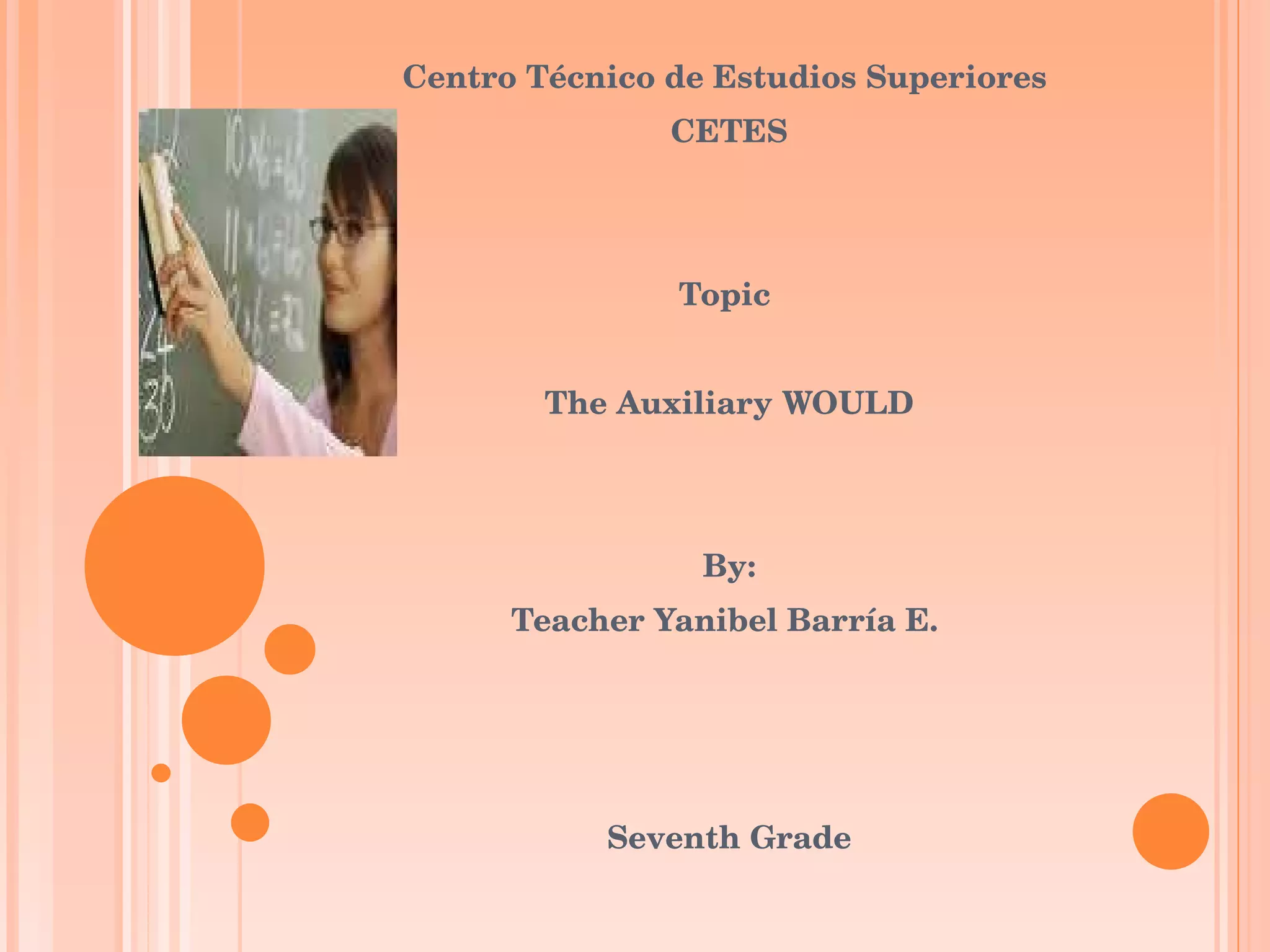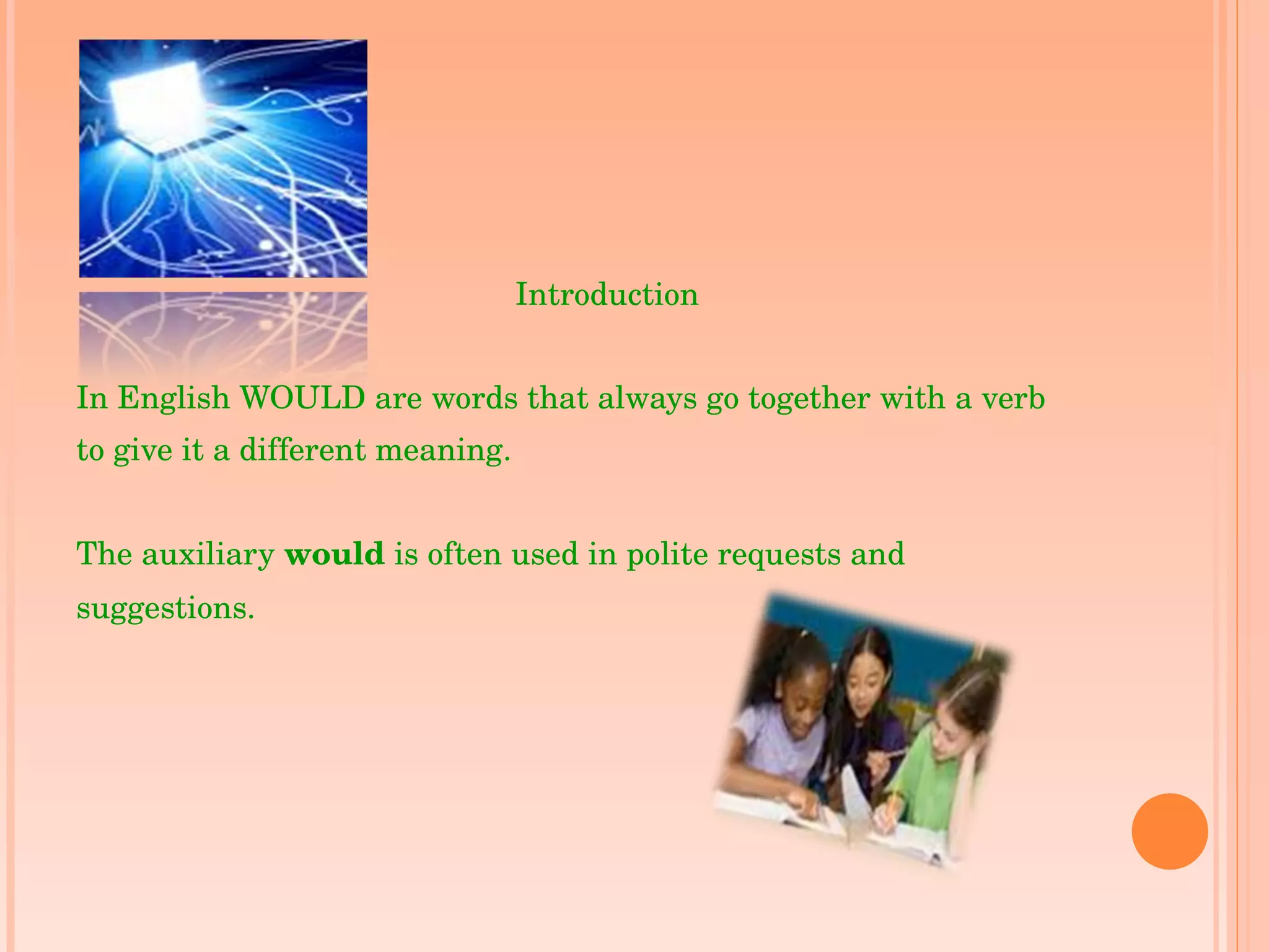 The document discusses the auxiliary verb "would" in English. It is often used to make polite requests and suggestions. To write a sentence with "would", the main verb comes after it without "to" and in its base form. Examples are given of affirmative sentences using "would" with different subjects. It also explains that to make a question, "would" comes at the beginning of the sentence, and examples of yes/no questions and responses are provided.