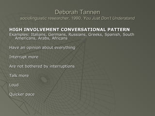This document discusses different patterns of verbal communication and participation structures, including high involvement vs high considerateness patterns, and high context vs low context communication. High involvement patterns are seen in cultures like Italy and Greece that interrupt more and talk louder and faster. High considerateness patterns are seen in cultures like the US and Japan that value turn-taking and avoid interrupting. High context communication relies more on shared understanding rather than explicit language, while low context communication requires more explicit language. The implications for language classrooms include teaching interruption skills and cultural conversation norms.