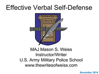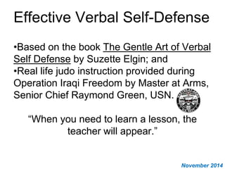 This document provides guidance on effective verbal self-defense techniques. It discusses various types of verbal attacks and provides examples and responses for each. The different sections cover attacks that begin with "If you really...", "Don't you even...", "Even you should...", "Everyone understands why...", and "A person who...". For each type of attack, the document explains the presuppositions and provides neutral, non-escalating responses to defuse the situation without responding emotionally. The overall message is that remaining calm, not escalating, and redirecting the conversation are key to effective verbal self-defense.