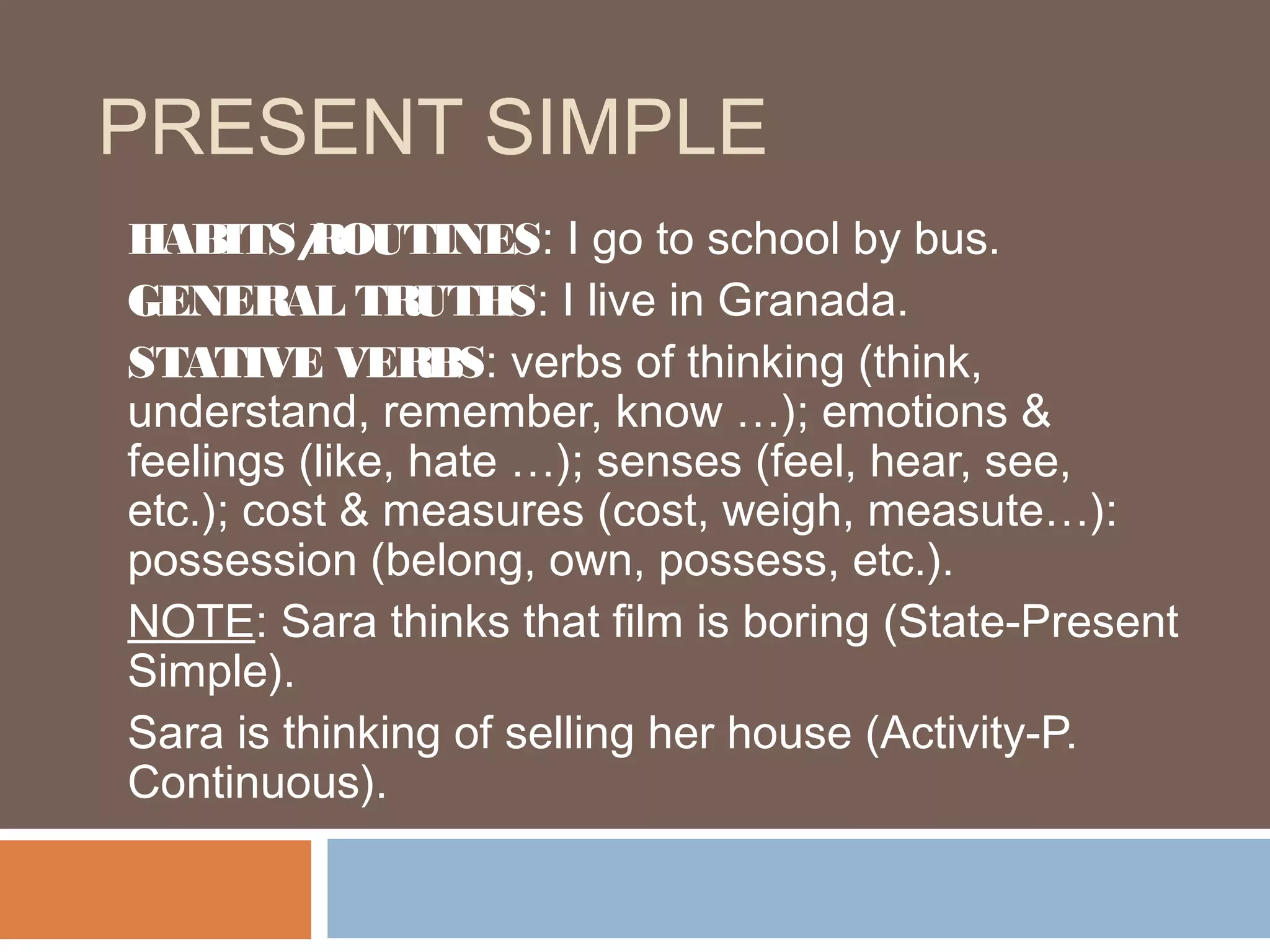 This document discusses the uses of the present simple tense in English. It is used to describe habits, routines, general truths, and states. Stative verbs like "think" and "feel" are also used in the present simple. The present continuous tense describes actions happening at the moment of speaking, temporary actions, and planned future actions. The past simple tense describes completed past actions, while the present perfect tense describes actions that began in the past and continue to the present or have relevance to the present. The future forms "be going to" and "will" are also discussed.