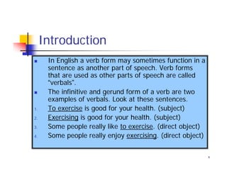 This document provides an overview of verbals, specifically infinitives, and how they function in sentences. It discusses how infinitives can function as subjects, subject complements, direct objects, adjectives, adjective complements, and adverbs. Examples are given for each function with notes on usage. The document is intended as a reference for understanding how infinitives are used in different roles within sentences.