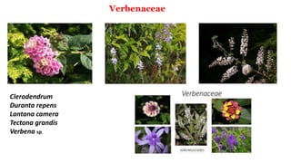 1) The document discusses the Verbenaceae plant family, including its classification, characteristics, economic importance, and examples of genera.