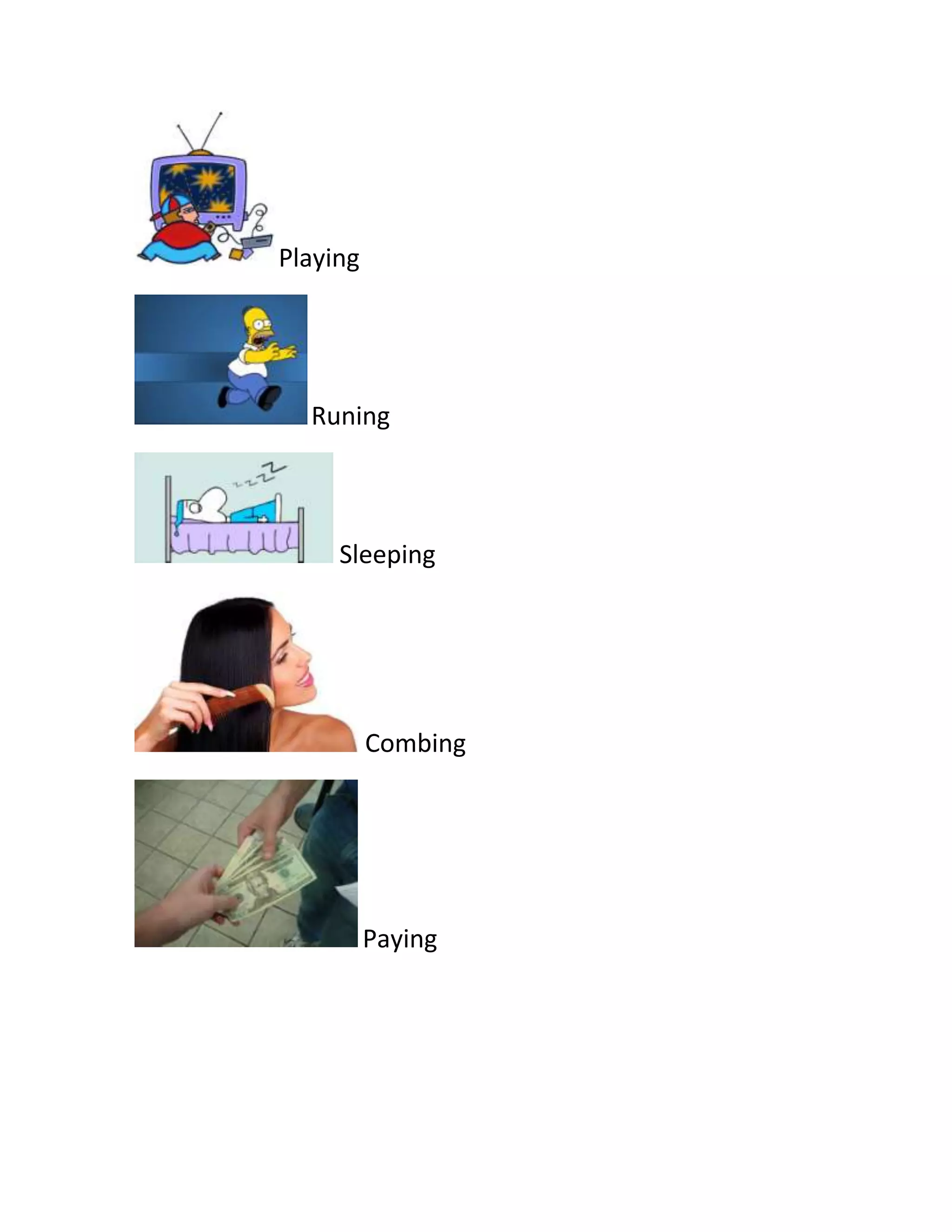 The document lists various activities including playing, running, sleeping, combing, paying, typing, brushing, reading, driving, and knitting. Most involve common daily tasks and hobbies that people engage in for work, leisure or personal care. The list covers a range of actions without additional context or detail about each item.