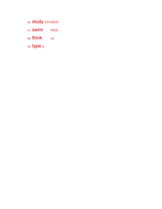 This document lists 19 verbs and provides their past tense forms. It shows how to conjugate regular verbs by adding "-ed" to form the past tense as well as some irregular past tense forms such as "go" becoming "went", "pay" becoming "payed", and "swim" becoming "swam". The purpose is to demonstrate how to write verbs in their past tense form.