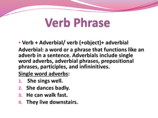 The document categorizes different types of verbs and their structures, including verb alone, verb with object, and verb with complement. It then discusses adverbials, providing examples of verbs used with single word adverbs, adverbial phrases, and prepositional phrases acting as adverbials. The examples given show how verbs can be used with different structures to modify or expand their meaning.