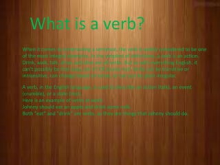 Verbs are an integral part of constructing sentences in English. They are used to describe actions, events, or states. There are different types of verbs including transitive verbs, which require a direct object, and intransitive verbs, which do not. Verbs also change form depending on tense - present, past, or future. However, some verbs are irregular and do not follow the typical conjugation patterns when changing tense. For example, the past tense of "drink" is "drank" rather than "drinked." This causes difficulties, especially for English language learners.
