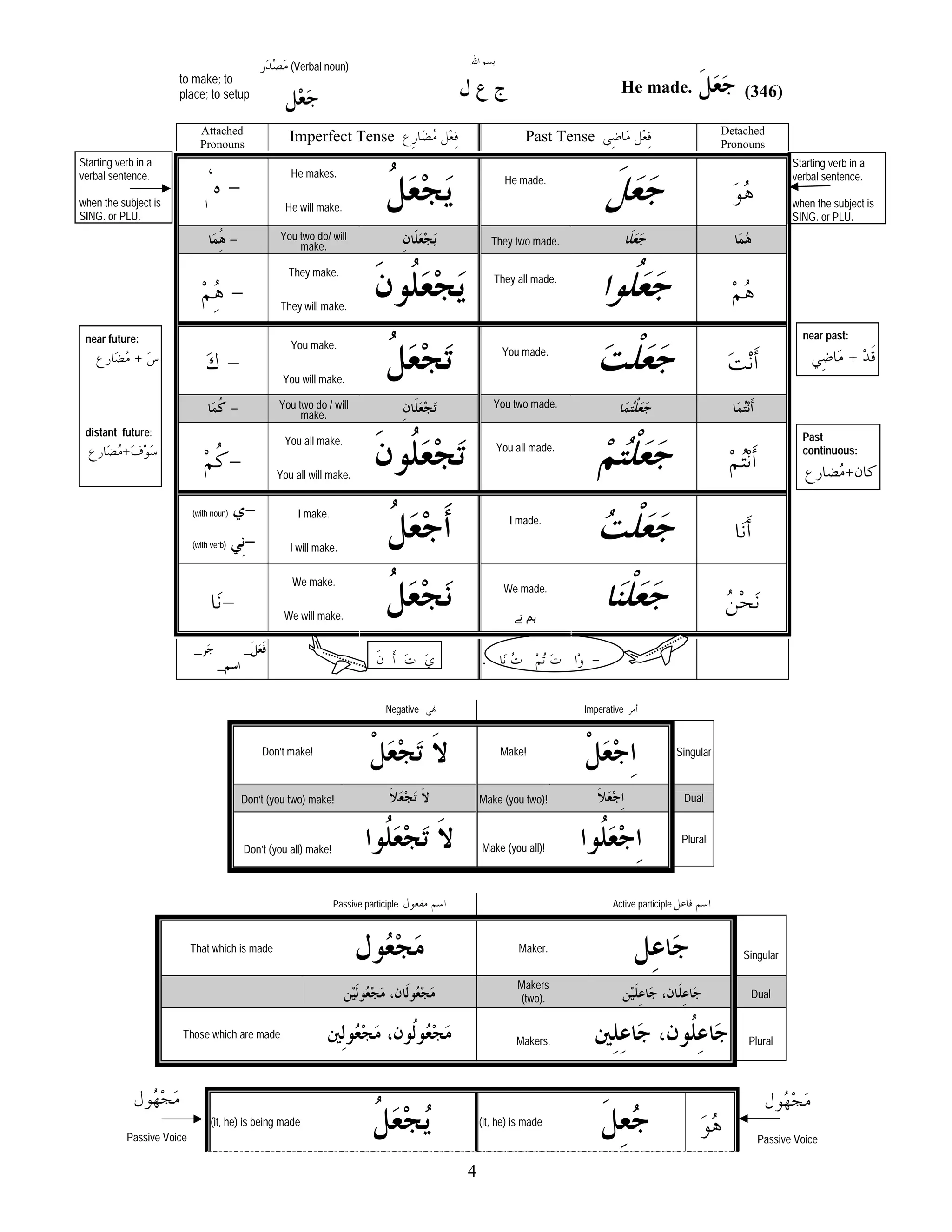 - Conjugations of the verb "to make" in past, present, future, and imperative tenses for singular, dual, and plural subjects.