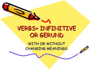 Verbs can be followed by either an infinitive or gerund with or without changing the meaning. Some verbs change meaning depending on whether an infinitive or gerund is used, such as verbs of liking which use a gerund for general likes and infinitive for specific moments. The tense of the verb also impacts whether an infinitive or gerund is used, with past tense often using gerunds and other tenses using infinitives. Certain time-related verbs like remember, forget, and regret take either an infinitive or gerund depending on whether the action follows or precedes the verb.