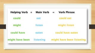Verbs can express actions or states and come in several types including action, linking, and auxiliary verbs. Action verbs are either transitive or intransitive depending on whether they take a direct object, while linking verbs connect the subject to additional information about it. Subject-verb agreement dictates that the verb must match the subject in number, with singular subjects taking singular verbs and plural subjects taking plural verbs.
