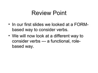 This document discusses verbs and verb phrases. It explains that verbs can be divided into two categories: lexical verbs and auxiliary verbs. A verb phrase consists of a lexical verb and any auxiliary verbs. The lexical verb is the furthest verb to the right in the phrase. Auxiliary verbs serve grammatical functions and help lexical verbs. There are two types of auxiliary verbs: primary auxiliaries, which are formed from have, do, and be, and modal auxiliaries. The verbs do, be, and have can function as either lexical verbs or auxiliary verbs depending on their use in a phrase. Examples are provided to illustrate lexical verbs, auxiliary verbs, and how do, be, and have can be either.