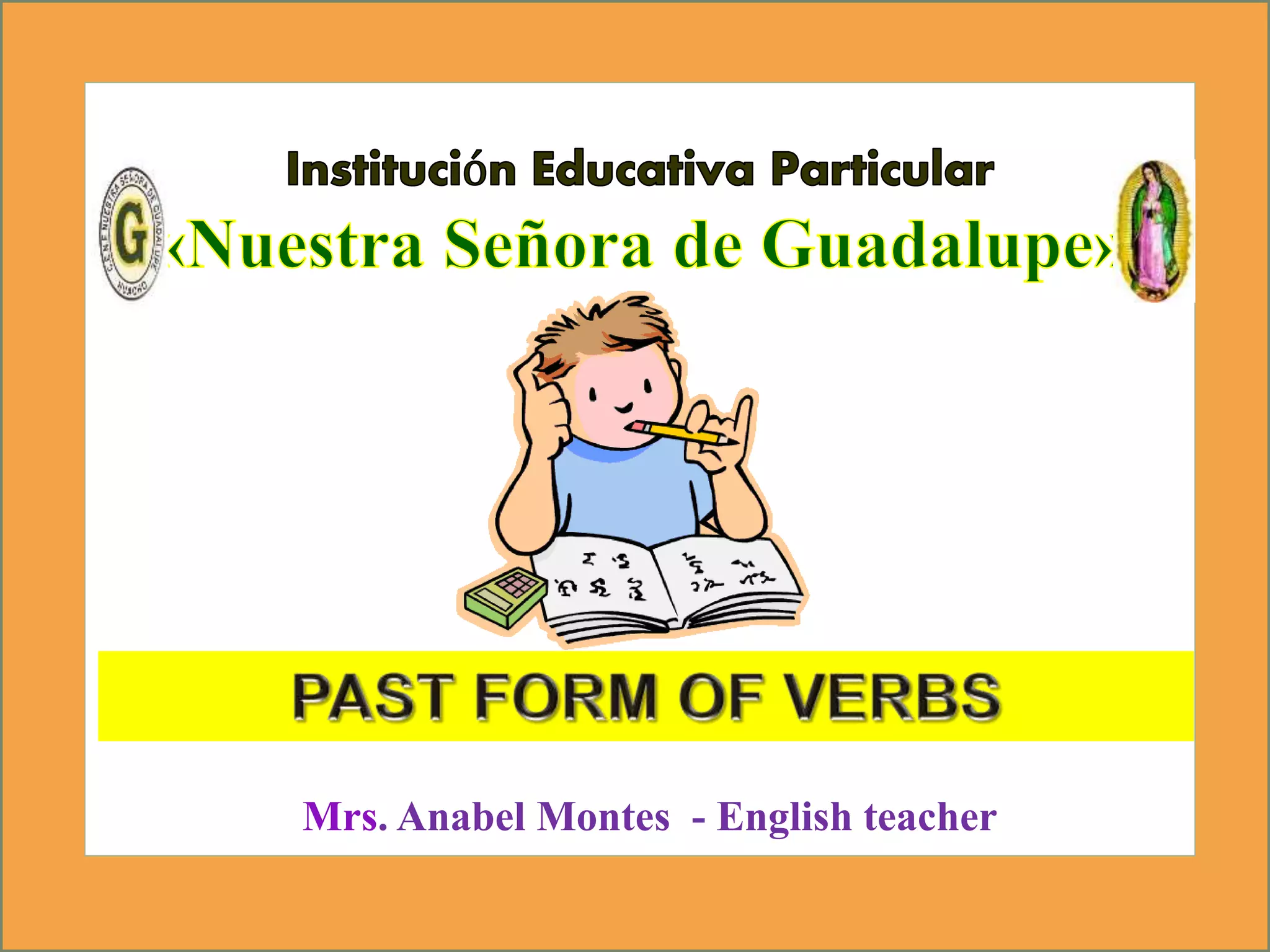 The document provides instructions for a study activity involving regular verbs. Students are asked to look at an online presentation about regular verbs, then draw a chart with verbs in their base form and past form along with the meaning. Example verbs are provided like "stop" and "stay". Students are then instructed to listen and translate, and look at pictures to make sentences using the regular verb forms.