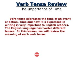 The document reviews the 12 verb tenses in English. It provides examples for each tense, explaining how they are used to express time and duration. The tenses covered are the simple present, present progressive, simple past, past progressive, present perfect, past perfect, future with will/be going to, simple future, and future progressive.