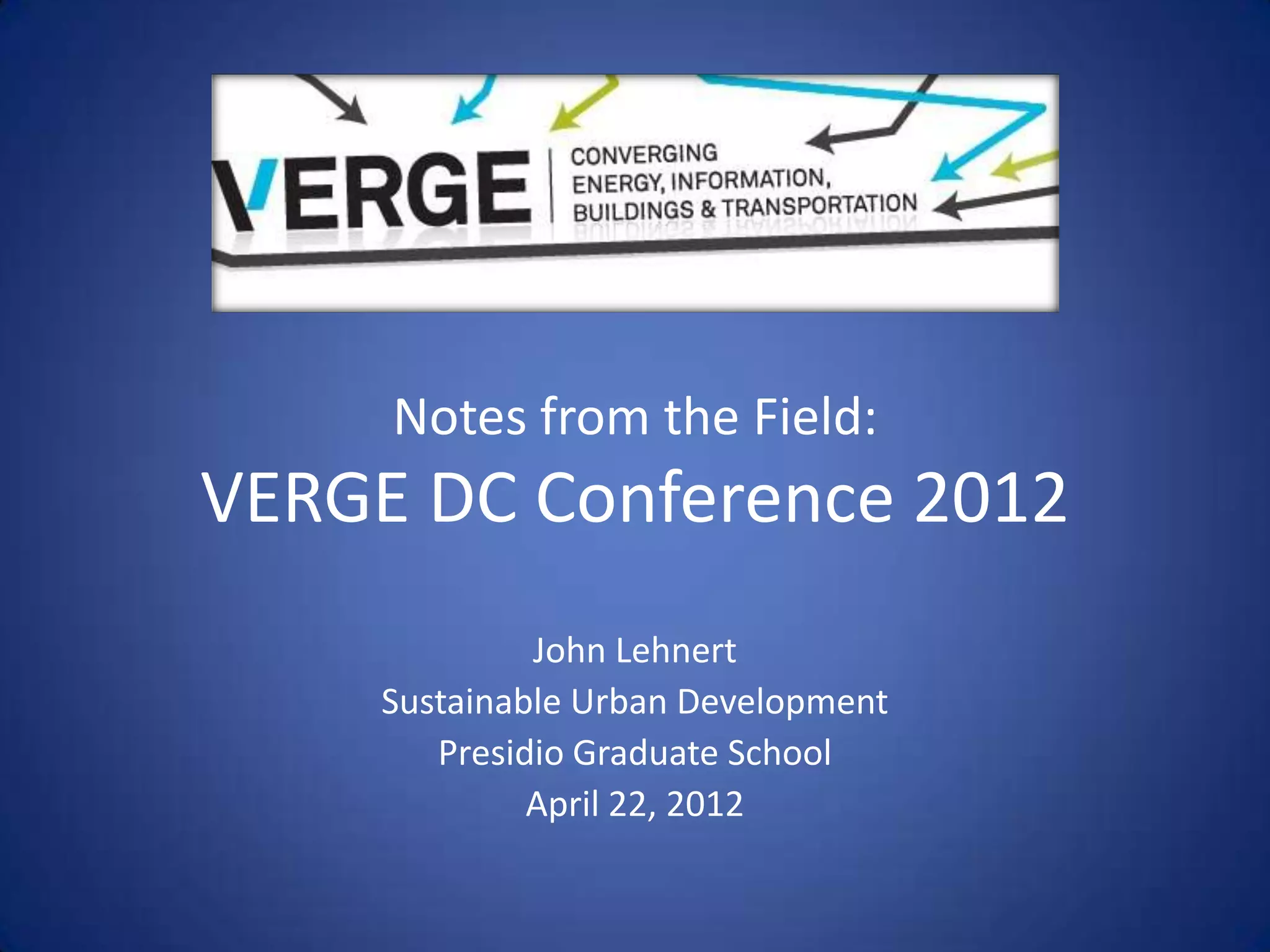 The document summarizes key points from the Verge DC 2012 conference on sustainable urban development. It discusses how energy, transportation, buildings, and information technologies are converging to make cities more sustainable and efficient. Population growth and urbanization trends will make cities important drivers of sustainability and innovation over the coming decades. The conference covered topics like smart energy grids, electric vehicles, green buildings, open data platforms, and new tools and policies that allow cities to experiment and collaborate on sustainability solutions.