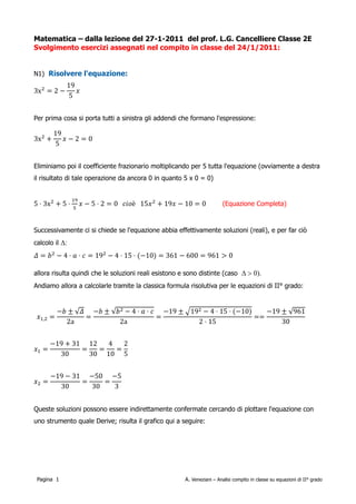 Il documento analizza il compito in classe di matematica riguardante le equazioni di secondo grado, illustrando vari esempi di risoluzione e condizioni per le soluzioni reali. Viene discussa la determinazione del discriminante e la possibilità di ottenere soluzioni coincidenti o opposte in base ai parametri dell'equazione. In aggiunta, si menzionano conferme visive attraverso grafici delle equazioni trattate.