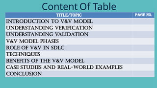 The verification and validation (V&V) model is a software engineering process that ensures a product meets its specifications and fulfills its intended purpose. It involves systematic checks throughout the software development life cycle (SDLC) to identify defects early, improve software quality, and enhance user satisfaction. Key phases of V&V include requirements analysis, design verification, code verification, and various testing phases, all integral to delivering reliable software solutions.