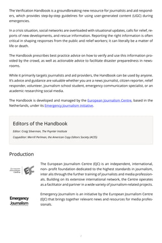 The Verification Handbook provides step-by-step guidelines for journalists and aid workers to verify user-generated content during emergencies by drawing on expertise from leading news organizations, NGOs, technical communities, and the UN. The guidelines emphasize preparing verification processes and standards in advance, developing human sources, communicating with other professionals, and using tools like EXIF readers and Twitter searches while verifying both the source and content of information. The Handbook aims to help separate news from rumors and misinformation by training professionals in verification best practices.