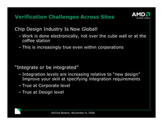 Verification teams at chip design companies now work globally, presenting communication challenges. Time zone differences make real-time collaboration difficult, and documentation through tools like TWiki can suffer if not well-organized. However, global teams also provide benefits by making more people and creative ideas available. Companies like AMD are addressing these issues through centers of expertise that standardize methodologies, tools, and components to facilitate collaboration across sites, while still allowing projects flexibility and innovation. Regular reviews help continuously improve processes as new techniques are adopted or abandoned.