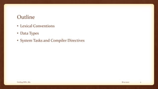 This document discusses basic concepts in Verilog HDL including lexical conventions, data types, and system tasks and compiler directives. It covers topics such as keywords, operators, numbers, comments, nets, registers, vectors, integer/real/time data types, arrays, memories, parameters, and strings. Examples of system tasks like $display, $monitor, $stop, and $finish are provided along with examples of compiler directives like `define and `include.