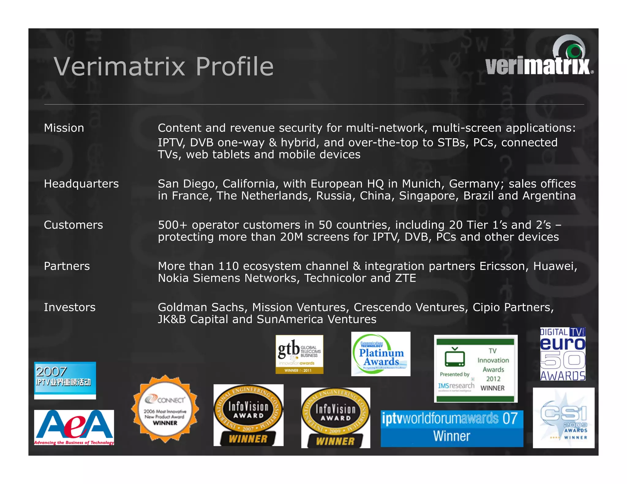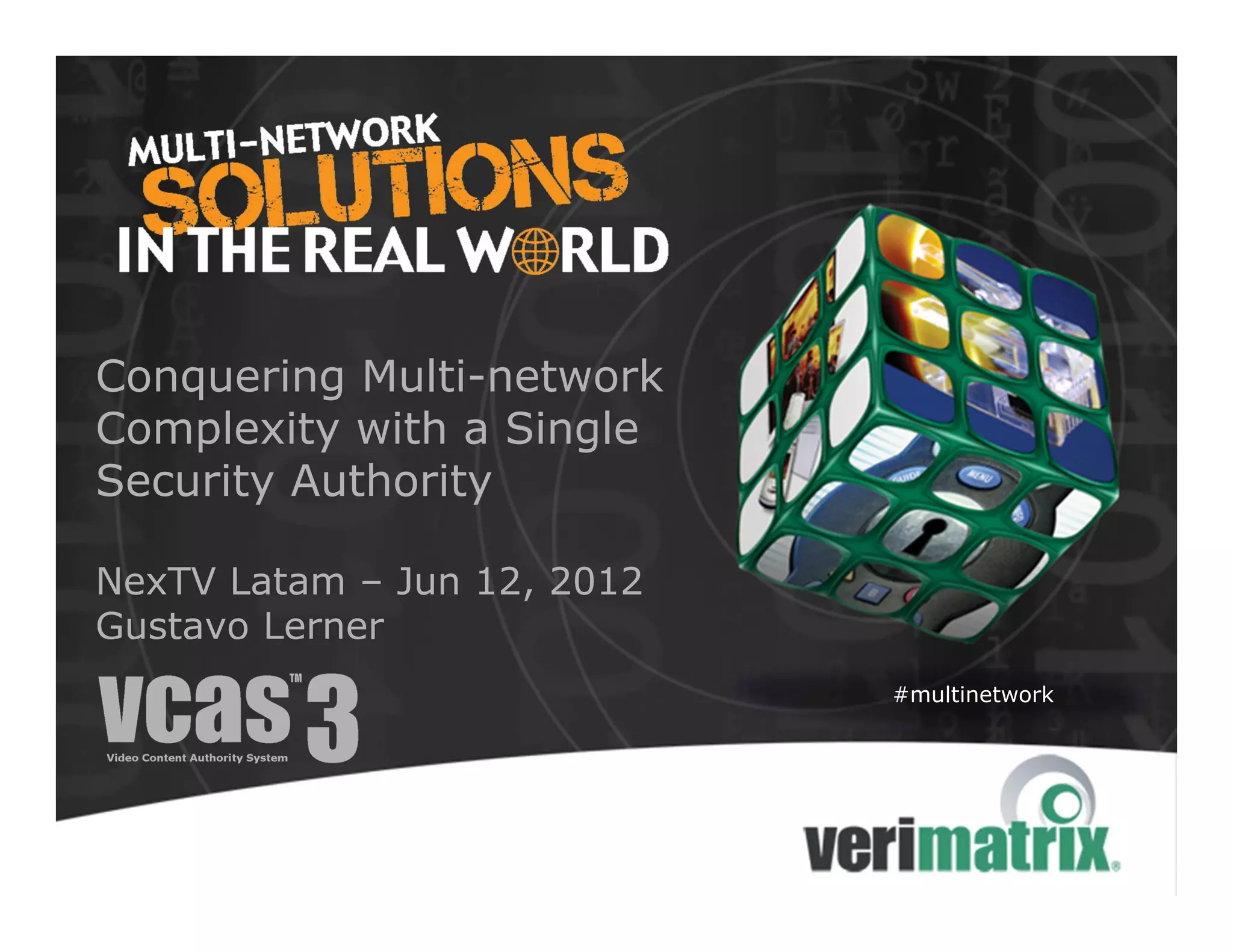 Verimatrix provides content security solutions for multi-network deployments across IPTV, satellite, cable and OTT services on devices such as set-top boxes, PCs, connected TVs and mobile devices. The document discusses Verimatrix's VCAS 3 architecture which provides a unified subscriber management system and security for linear channels, video-on-demand and multi-screen services on multiple networks. Examples are given of deployments by operators such as Etisalat to secure their IPTV and OTT platforms.