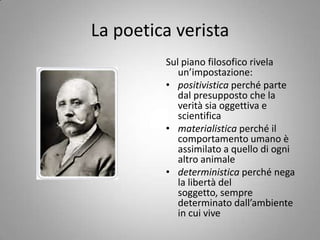 Negli anni '70 dell'Ottocento, il naturalismo influenza il movimento verista in Italia, con opere significative come 'L'Assommoir' di Zola e 'Rosso Malpelo' di Verga. Il verismo si distingue dal naturalismo per la sua attenzione all'aspetto tecnico-formale e per ridurre la teoria naturalistica a un metodo di scrittura, mantenendo un'impostazione positivistica, materialistica e deterministica. Scrittori come Capuana e Verga cercano di liberare la letteratura italiana dalle influenze romantiche e retoriche, concentrandosi sulla rappresentazione della realtà oggettiva.